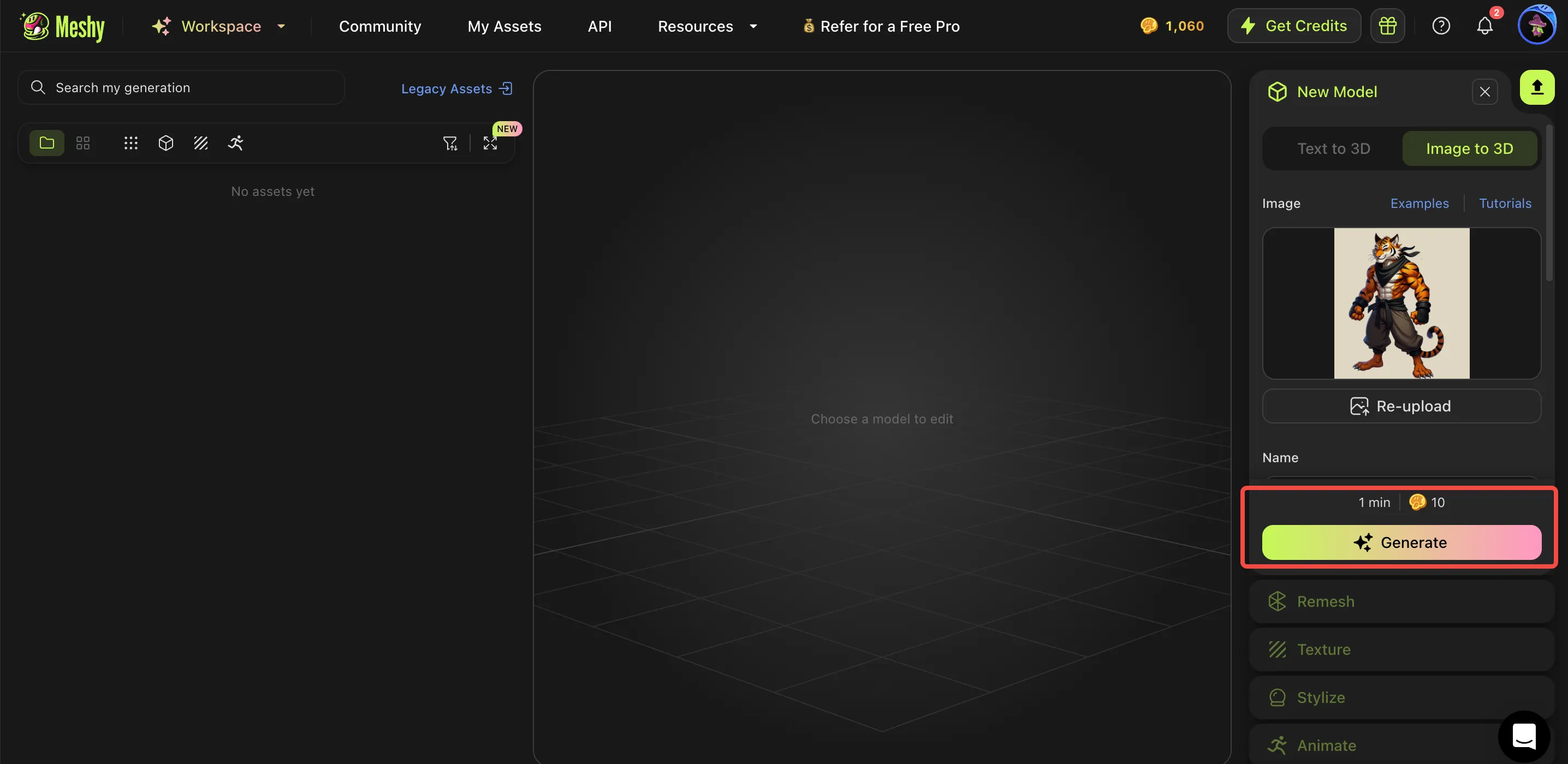 Otevřete Meshy a přejděte k nástroji „Image to 3D“. Nahrajte svůj vybraný JPG nebo PNG obrázek přímo do nástroje pro zahájení procesu převodu.