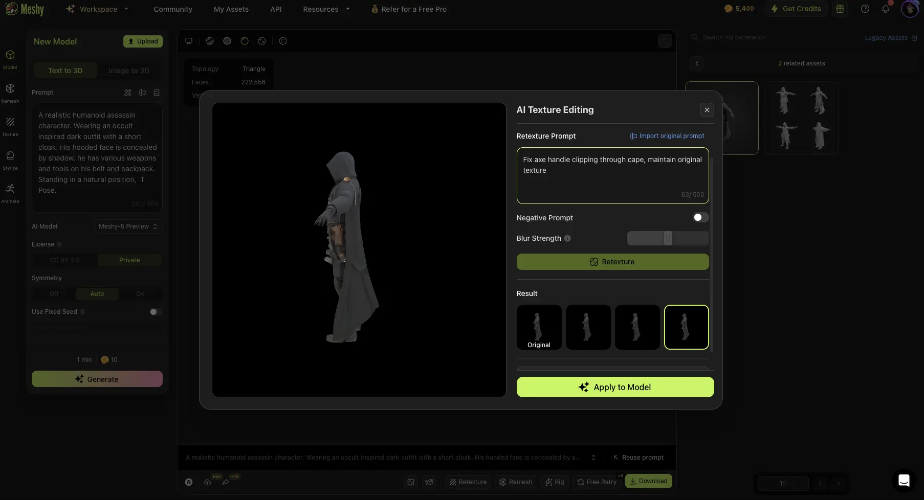Sobald du die falsche Textur behoben hast, versuche AI-Textur-Bearbeitung, um einzelne Teile des Charakters mit neuen Prompts zu modifizieren.